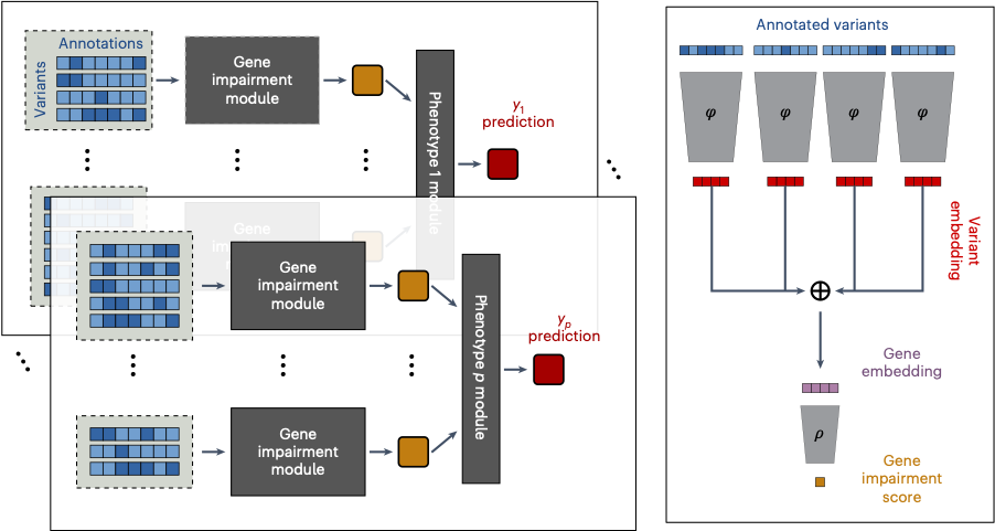 Using deep set networks, DeepRVAT learns gene-level impairment scores from variant annotations (e.g. conservation and splicing-related scores), boosting power for association testing in large biobank datasets. Compared with existing approaches, it increases gene discovery and improves identification of individuals with high genetic risk in population-scale studies - supporting deeper insights into disease biology and more informative genetic risk stratification.